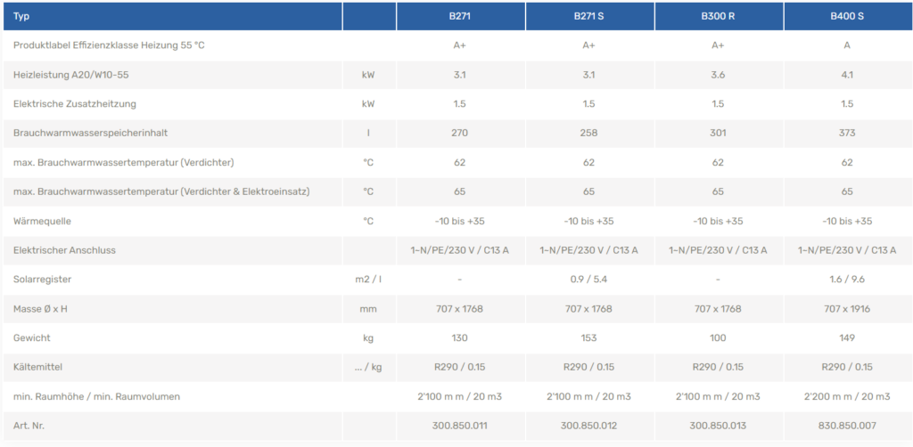 Le pompe di calore per acqua calda sanitaria B271 fino a B400 sono ideali per l’installazione interna in edifici nuovi ed esistenti. I modelli si differenziano come segue: